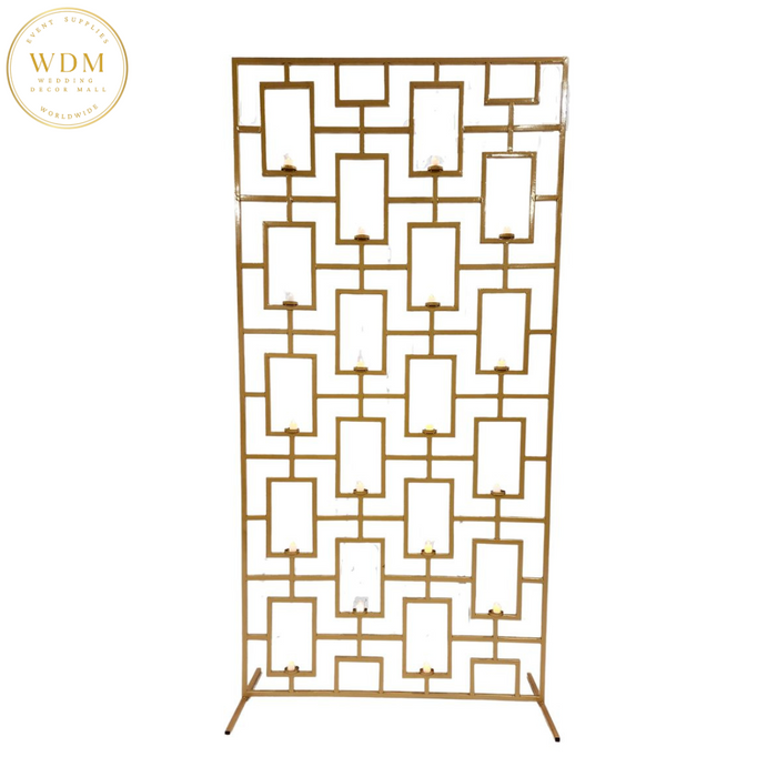 This stunning gold candle wall holds multiple tealights and can be used as a backdrop for weddings, parties, and other events. The luxurious gold color and intricate design adds a sophisticated touch to any display. Each stand consists of 1 complete body and 2 bases.