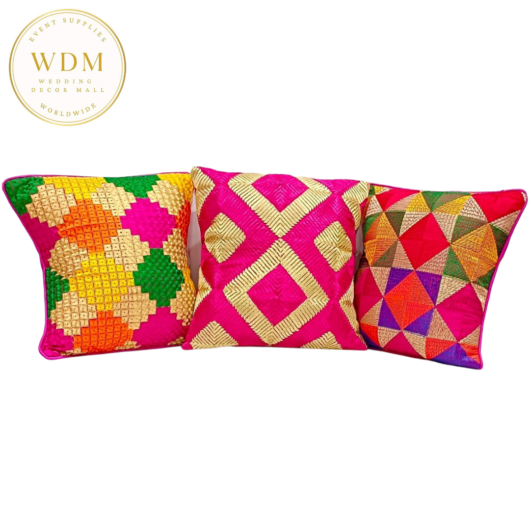 Pack of two elegant phulkari tribal throw cushion covers with a luxurious design. Great for decorating events or as an extra touch to your furniture at home. These decorative throw pillows will refresh any setting with their chic design and soft touch. Designed in solid colors, these cushion covers suit both the minimalist tendencies of modern décor and the sophistication of traditional ones. No zipper closure.