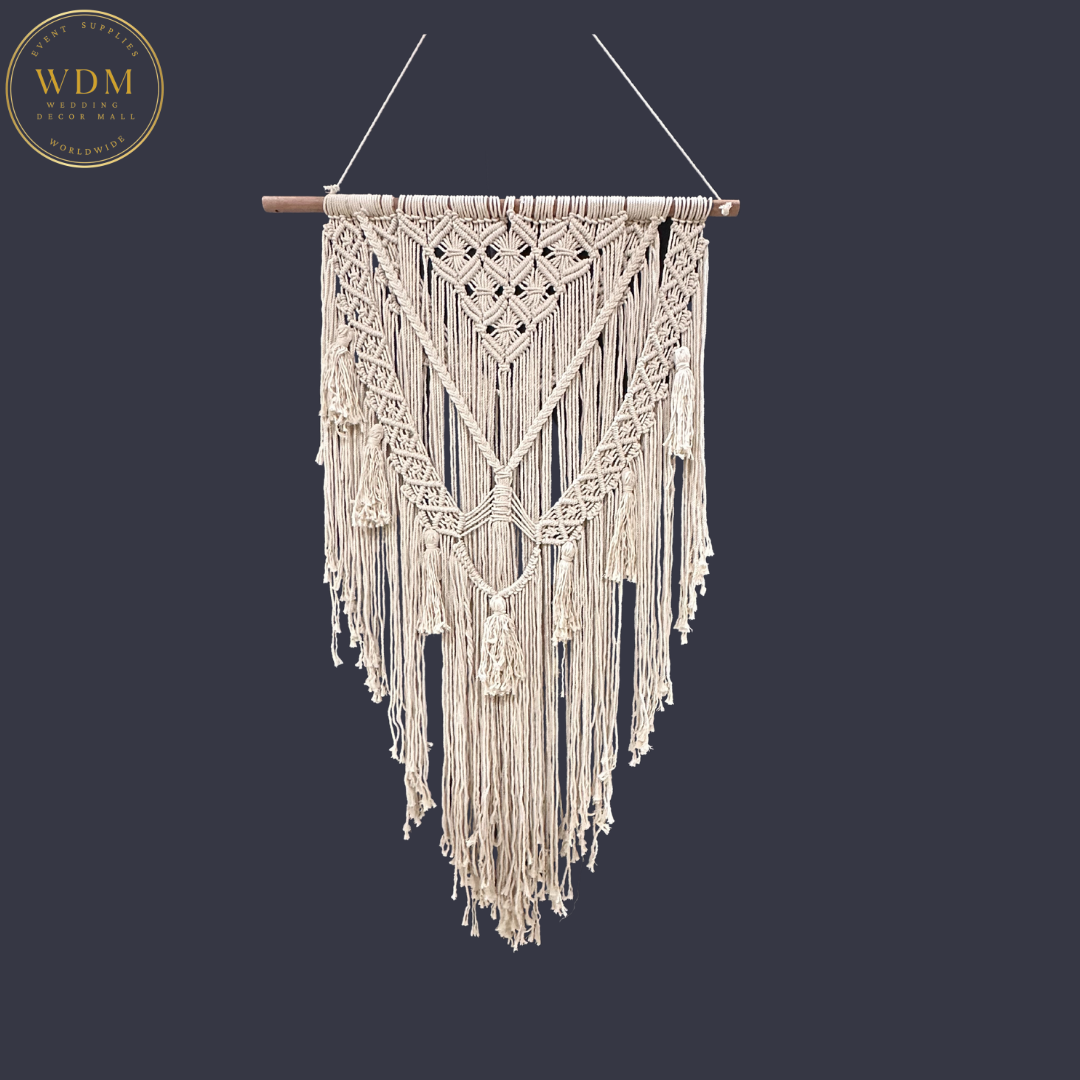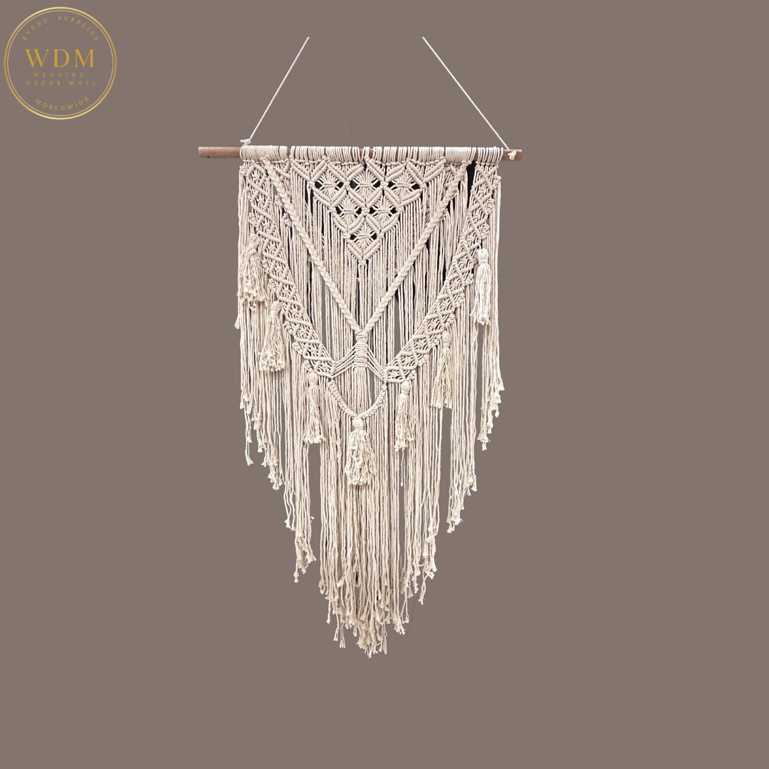 This meticulously knitted macrame wall hanging with beautiful weaving pattern is made of natural cotton rope which is knotted on the wooden dowel. It is designed with beads and fringe accents. The elegant combination of tapestry and bohemian style adds a boho-inspired touch to any space and is suitable for various decoration styles.